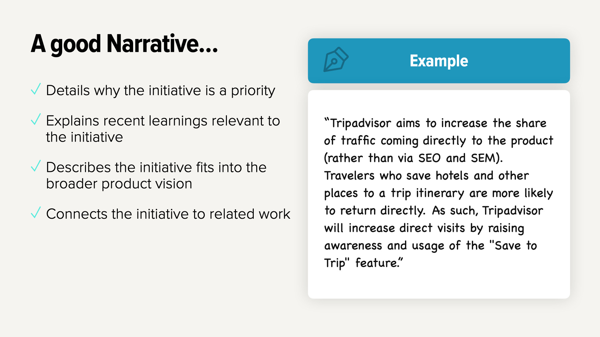 > The Narrative is a 1-3 sentence qualitative description of what the team wants to achieve and why it matters to the business. The Narrative’s purpose is to tie the team’s immediate work to the company’s long-term strategy. A well-structured narrative will provide the strategic context and guardrails that allow individuals to make better decisions. You can do this by including the following: