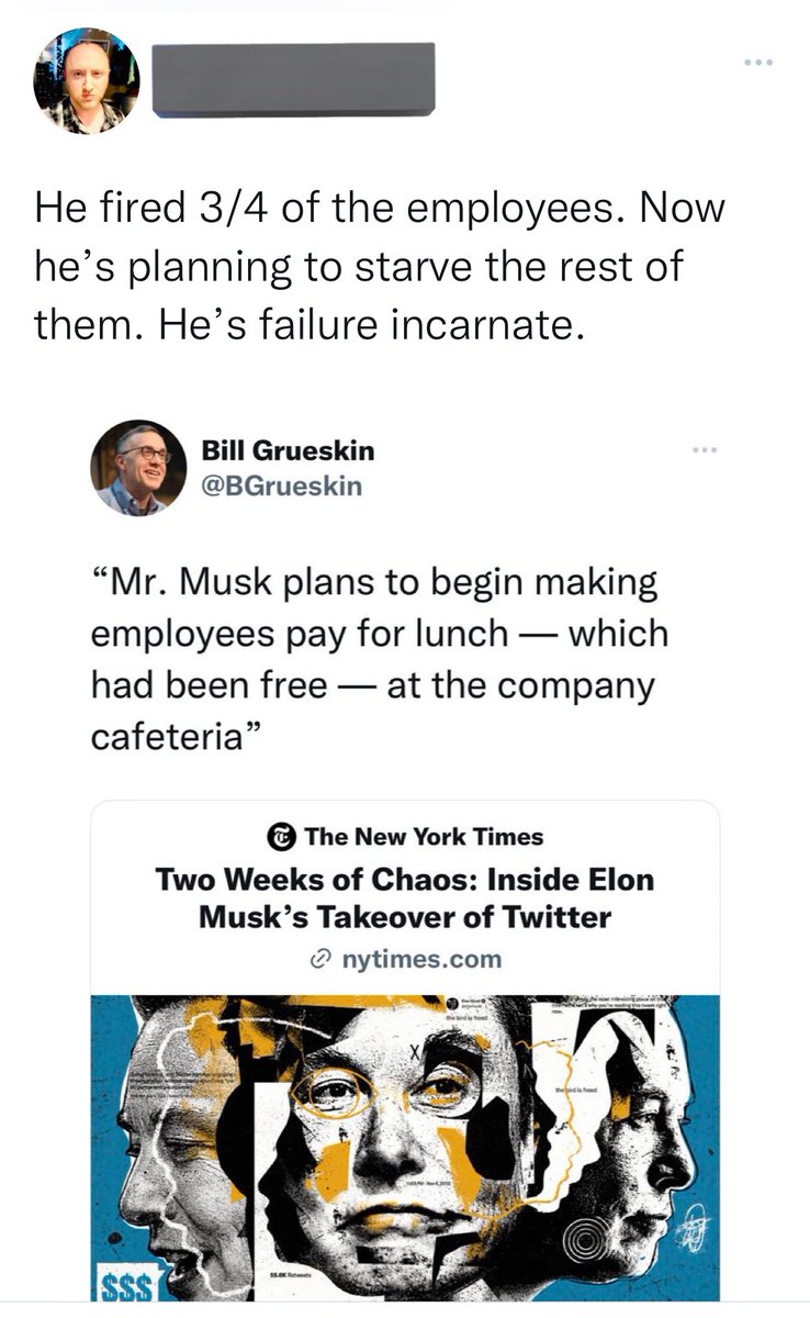 This is winter now. If you can’t find food you die. Twitter was losing money when Elon took the company. We’re not watching him destroy anything, we’re watching him try to save a product he believes important, and similar battles are taking place across the industry. They’re just happening in private.