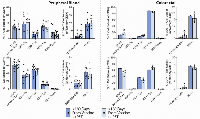 =central memory, TEM =effector memory, TEMRA =effector memory RA+/terminally differentiated) and frequency of lymphocytes co-expressing activation markers CD38/HLA-DR and immune checkpoint PD-1 from peripheral blood and gut for those who underwent PET imaging <180 or >180 days following the last dose of COVID-19 vaccine are shown. No significant differences between post-acute COVID groups were identified.