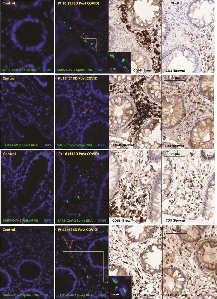In situ hybridization (ISH) of SARS-CoV-2 spike RNA and immunohistochemical staining of recto- sigmoid tissue. Panels represent from left to right: SARS-CoV-2 spike RNA staining by ISH in pre-pandemic tissue, SARS-CoV-2 spike RNA staining by ISH in post-acute COVID participant sample, and CD68 and CD3 chromogenic immunostaining. Red arrows denote representative areas of RNA detection across images for each sample (not all RNA detection is marked). Spike RNA was detected in all five of the post-acute COVID participants that underwent biopsy from 158 to 676 days following initial COVID-19 symptom onset and signal was primarily observed in cells located within the lamina propria. Four participants with detectable RNA in three distinct gut regions are shown, a fifth participant had rare spike RNA detected in only one of three regions imaged. A minority of SARS-CoV-2 RNA signal was localized in CD68+macrophages/immune cells and very rarely in CD3+T cells. No viral RNA was detected in the pre-pandemic COVID tissue. Only linear adjustments to contrast and brightness were used during image analysis, with the same parameters being applied to all case and control tissues which underwent identical slide processing and imaging protocols.