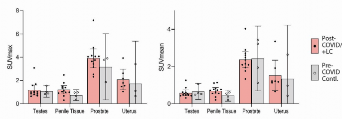 Supplemental Figure 2. [18F]F-AraG SUVmax and SUVmean for reproductive tissues for cases and pre- pandemic controls are shown. Bars represent mean SUVmax and error bars represent 95% confidence interval. No statistical differences were observed between cases and controls for any reproductive tissue ROI. All data points are shown.