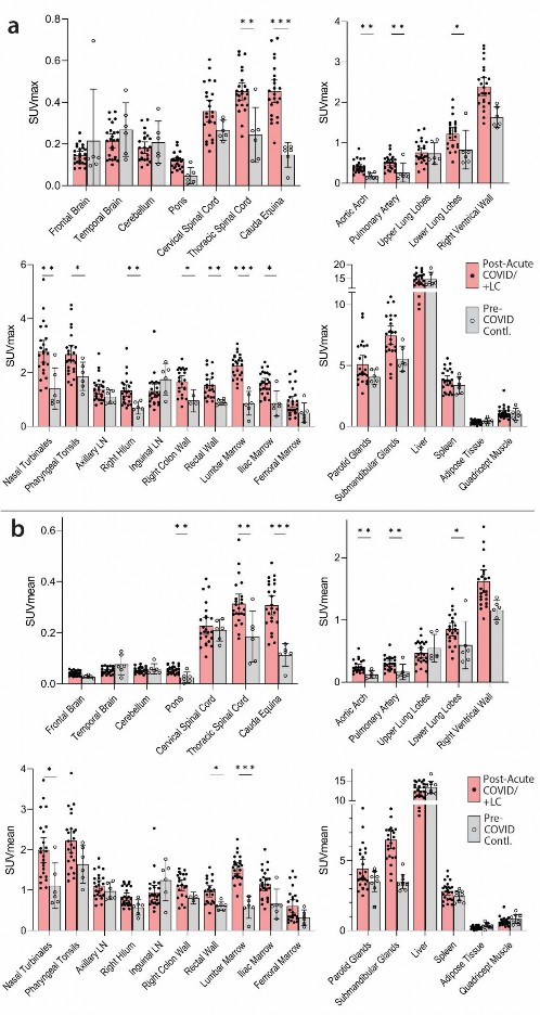 Figure 2. Comparisons of [18F]F-AraG standardized uptake values (SUV) in post-acute COVID cases and pre- pandemic control participants. Maximum SUV (SUVmax) (a) and mean SUV (SUVmean) (b) values for various anatomical regions of interest (ROI) are shown including post-acute COVID participants including those with any number of Long COVID symptoms (Post-acute COVID/+LC; N=18) and pre-pandemic controls (N=6). Bars represent mean SUVmax or SUVmean and error bars represent 95% confidence interval. Adjusted P values