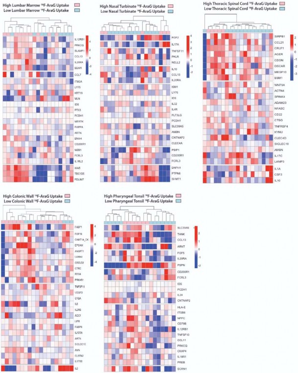 Supplemental Figure 6. Differential plasma protein expression in post-acute COVID participants grouped by high or low [18F]F-AraG uptake in representative tissues. Clustered heat maps of the top 25 differentially expressed plasma proteins from Olink Proximity Extension Assay EXPLORE 384 panel with markers grouped