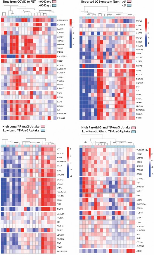 Clustered heat maps of the top 25 differentially expressed plasma proteins from Olink Proximity Extension Assay EXPLORE 384 panel with markers grouped into k-clusters based on similarity are shown for participants imaged early (<90 days) or later (>90 days) after symptom onset (a), those reporting >5 or <5 Long COVID symptoms (out of a total of 32 surveyed across multiple organ systems) at the time of PET imaging (b), and in those with high lower lung lobe [18F]F-AraG uptake (c; defined as SUVmax >2 standard deviations [SD] above the average SUVmax value measured in Pre-pandemic control volunteers), and parotid gland tissue [18F]F- AraG uptake (d; defined as SUVmax >1 SD above the average SUVmax value measured in pre-pandemic control participants). Note that modules of various gene products representing inflammation and immune activation have higher differential expression in participants with >5 Long COVID symptoms and with higher [18F]F-AraG uptake in tissue. Heat maps clustered by high uptake in other tissues ROIs were less revealing and shown in Supplemental Figure 4)