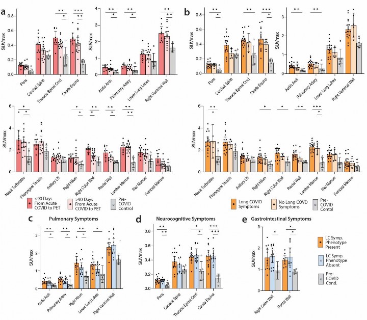 Figure 3. Comparisons of [18F]F-AraG maximum standardized uptake values in post-acute COVID cases and control participants grouped by time from initial COVID-19 symptom onset to PET imaging and by Long COVID symptoms. SUVmax values in tissue ROIs in post-acute COVID participants imaged <90 days or >90 days from acute infection onset and control volunteers are shown in (a). SUVmax values in tissue ROIs in post- acute COVID participants with or without Long COVID symptoms reported at the time of imaging and control volunteers are shown in (b). SUVmax values in tissue ROIs in post-acute COVID participants with or without pulmonary symptoms (c), neurocognitive symptoms (d) and gastrointestinal symptoms (e) are also shown.