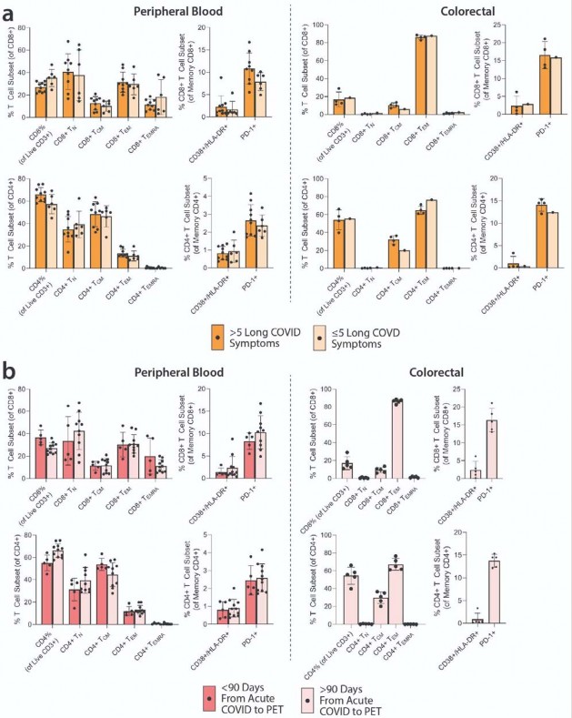 Supplemental Figure 7. Spectral flow cytometry results for T lymphocyte phenotypes. The frequency of CD8+ and CD4+ T cell subsets (TN =naïve, TCM =central memory, TEM =effector memory, TEMRA =effector memory RA+/terminally differentiated) and frequency of lymphocytes co-expressing activation markers CD38/HLA-DR and immune checkpoint PD-1 from peripheral blood and gut for those with >5 or <5 Long COVID symptoms (a) and those imaged >90 or <90 days after onset of acute COVID-19 (b) are shown. No significant differences between post-acute COVID groups were identified. Bars represent percent of T cells expressing markers of interest and error bars represent 95% confidence intervals.