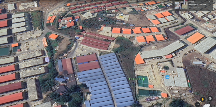 谷歌地球上的KK园区,赫然写着焚烧区、水牢、集中营、狗推终点站等惊悚的地标。(图/Google Earth)