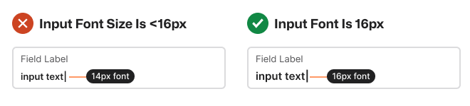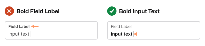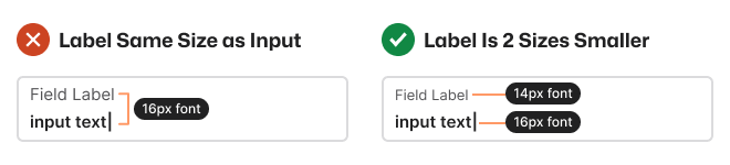 When the field label and input text have the same font size, it's hard for users to differentiate them. Labels should be two font sizes smaller than the input.