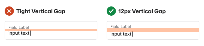 The inner padding around the field should always be an even 12px. Uneven padding will make the label and input look odd and inconsistent.