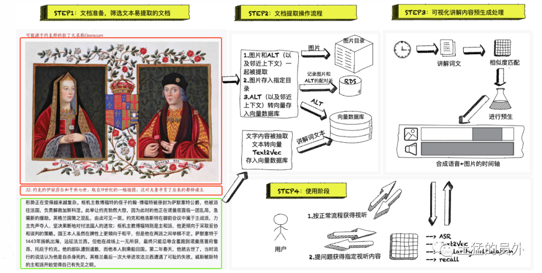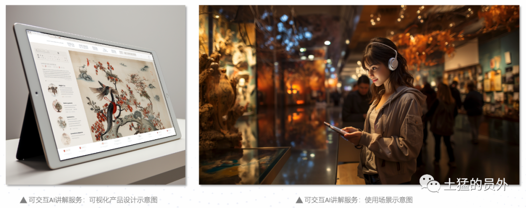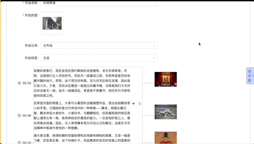 - 内容快速预生成:这也是支撑整个产品逻辑的底层核心。我希望是,内容运营人员挑选一本关于目标文物的电子书并上传,系统就可以自动将电子书内容做解读,分离图文,提取出很多小故事,然后自动生成一段一段的讲解视频。这才能满足100x的内容制作效率,才能时常更新内容,也能满足快速扩张的需要;