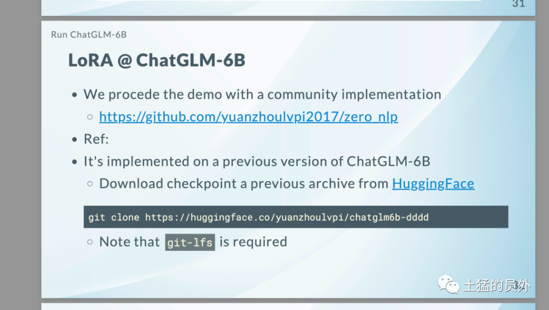 - 参与大模型社区:在今年2月份,我们团队发布了最早的ChatGLM-6B社区版LoRA版本代码——(见下图)获得智谱官方PPT的介绍,这个Github Repository就是我们团队的;