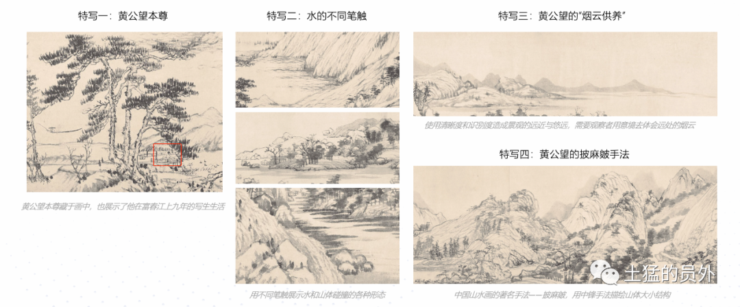 特写一:黄公望把自己也已经画进了《富春山居图》中,也是对他自己在富春江畔九年的写生生活留下一个缩影;