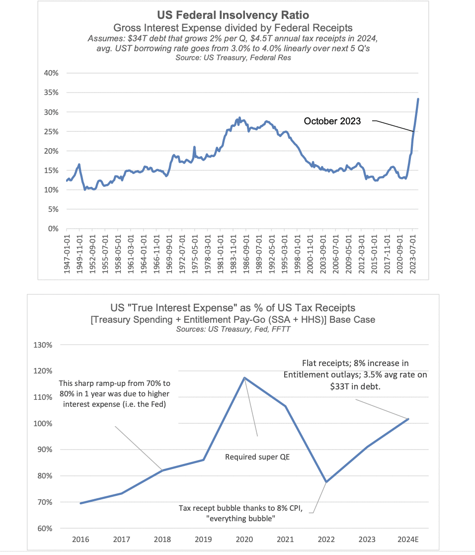 This in turn is important because as we have been highlighting ad nauseum for the past 3+ months, a recession is NOT a policy option with the US insolvency ratio where it is (first chart) and US “True Interest Expense” about to go back >100% of US Federal receipts – in all prior instances of the insolvency ratio and True Interest Expense being this high, the USD was weakened significantly and immediately; a MUCH weaker USD is required, ASAP.
