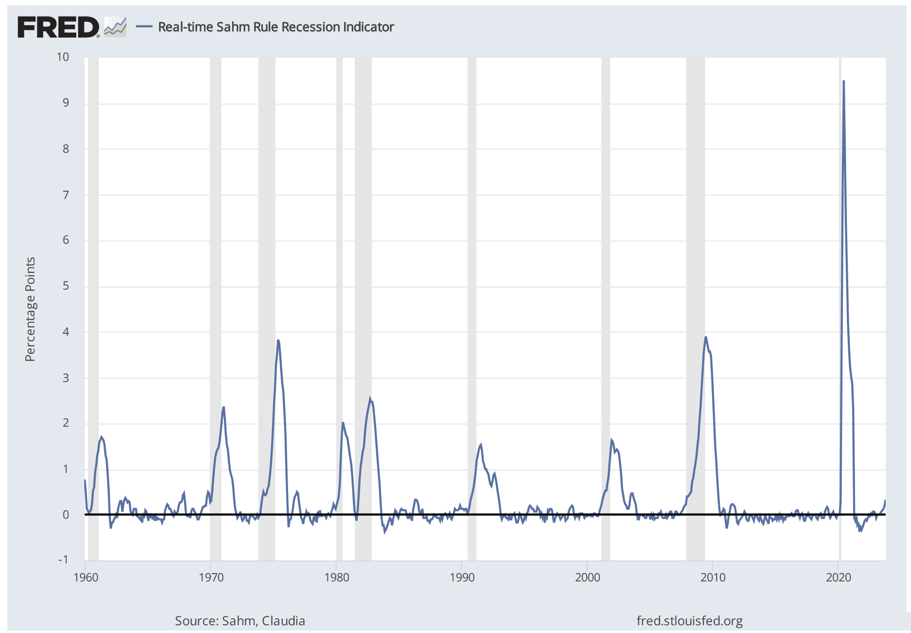 Sahm Recession Indicator signals the start of a recession when the three-month moving average of the national unemployment rate (U3) rises by 0.50 percentage points or more relative to the minimum of the three-month averages from the previous 12 months.
