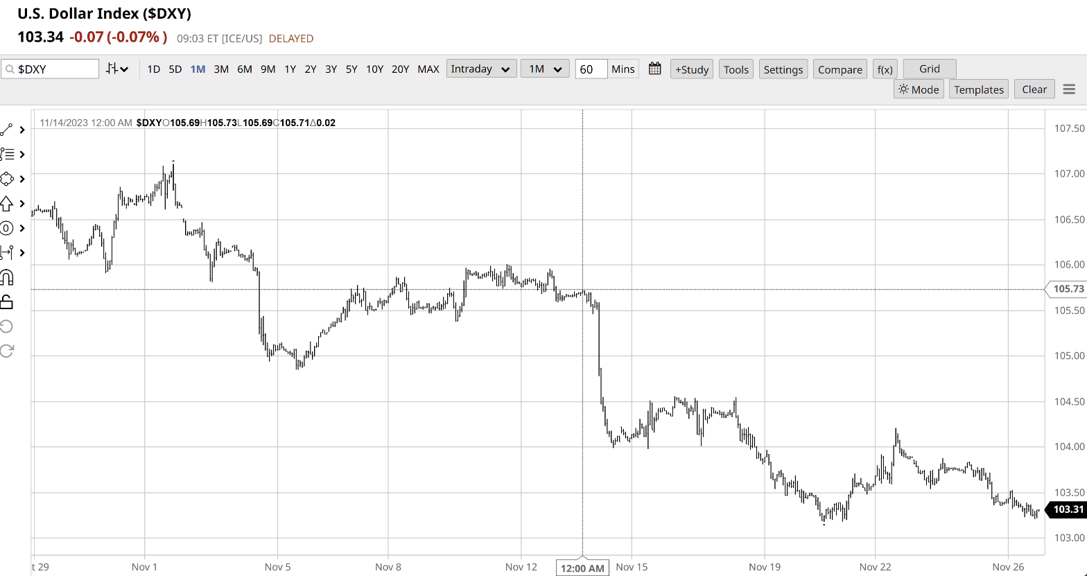 Nominally, the move down in the USD beginning on November 14 can easily be explained away – that was the day of the weaker-than-expected US CPI report, which occurred into a consensus position that was clearly positioned for continued “Higher for Longer” (given the reaction in markets)...as long as we assume that the US or any other country would never report an important data point with a policy goal in mind (weaker CPI would have weakened USD, and it did):