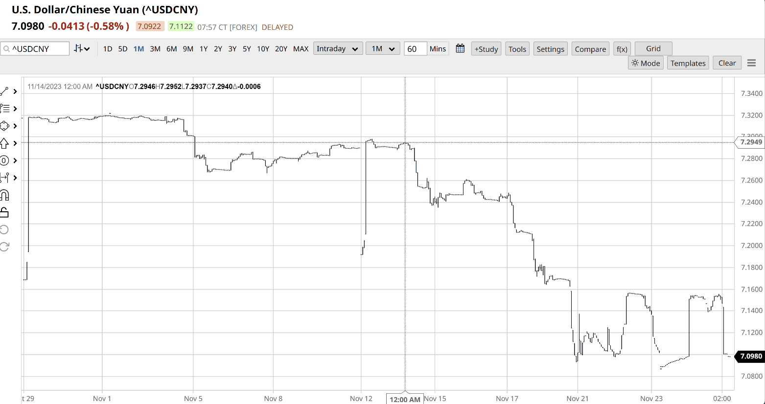 Beginning on November 14 (the day before Biden and Xi officially met), CNY/USD began rising sharply...