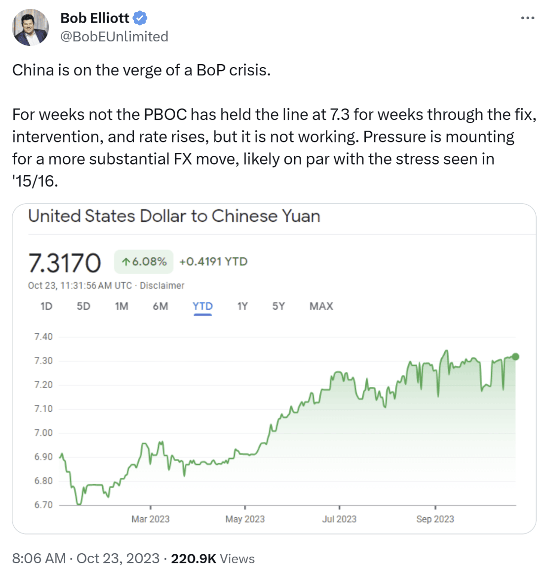 Bob Elliott summarized the challenges China was facing as of October 23, 2023, as they were manifesting in the CNY...