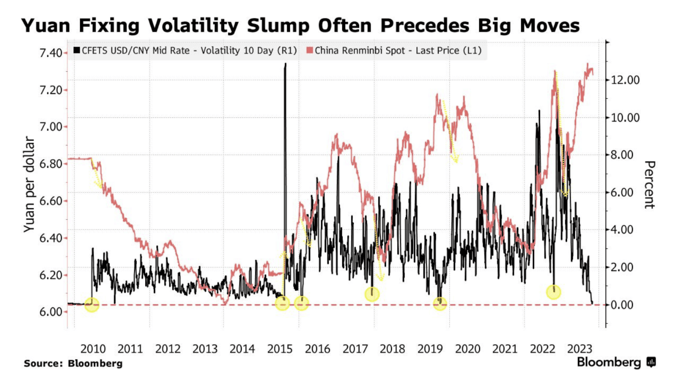 Equally critically, prior collapses in CNY fixing volatility in late 2015, late 2017, 3q19, and 3q22 (per above) presaged pronounced CNY strength and USD weakness (yellow circles below):