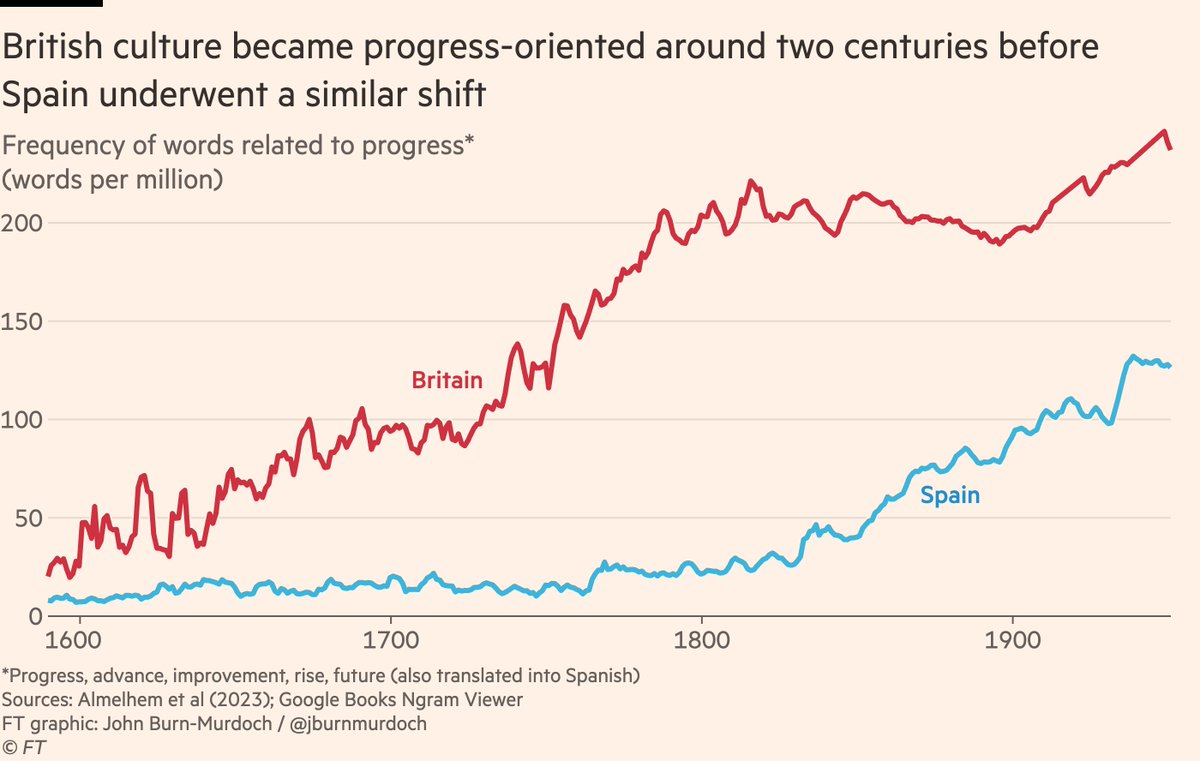 And NB it’s not just that people write more about progress when their country is progressing. Britain’s cultural shift preceded its economic acceleration, as did Spain’s