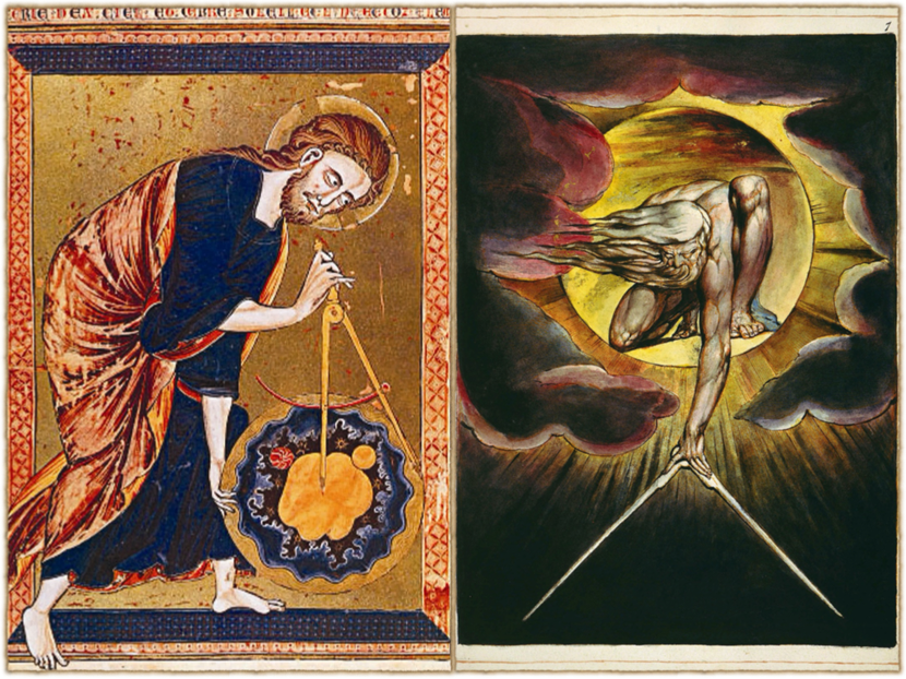 在近代,上帝甚至被当作一个数学家来看待,因为当时认为上帝创世用的就是数学家的方式,你看这两幅流传于15、16世纪关于上帝创世的画,上帝都是拿着圆规,像数学家一样在操作。