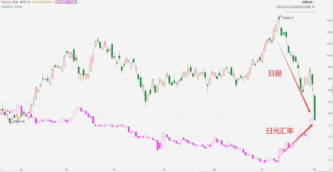 可一旦日本开始加息缩表,日元汇率飙升,情势就要逆转了。事实上,今年日股的见顶和日元的见底完全同步。此后,日元汇率暴力回升,日股也开启了暴力下跌。具体见下图。