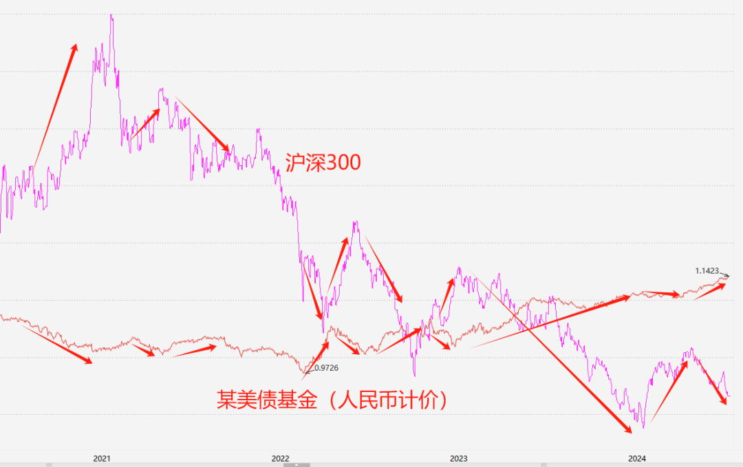 所以持有A股可以部分对冲美债的汇率风险。事实上,沪深300指数和某美债基金近年走势如下图。二者呈现明显的反向走势。
