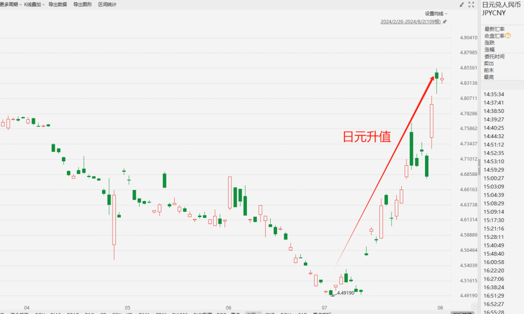 如下图所示,7月初起,日元相对于人民币暴力升值了8%左右。