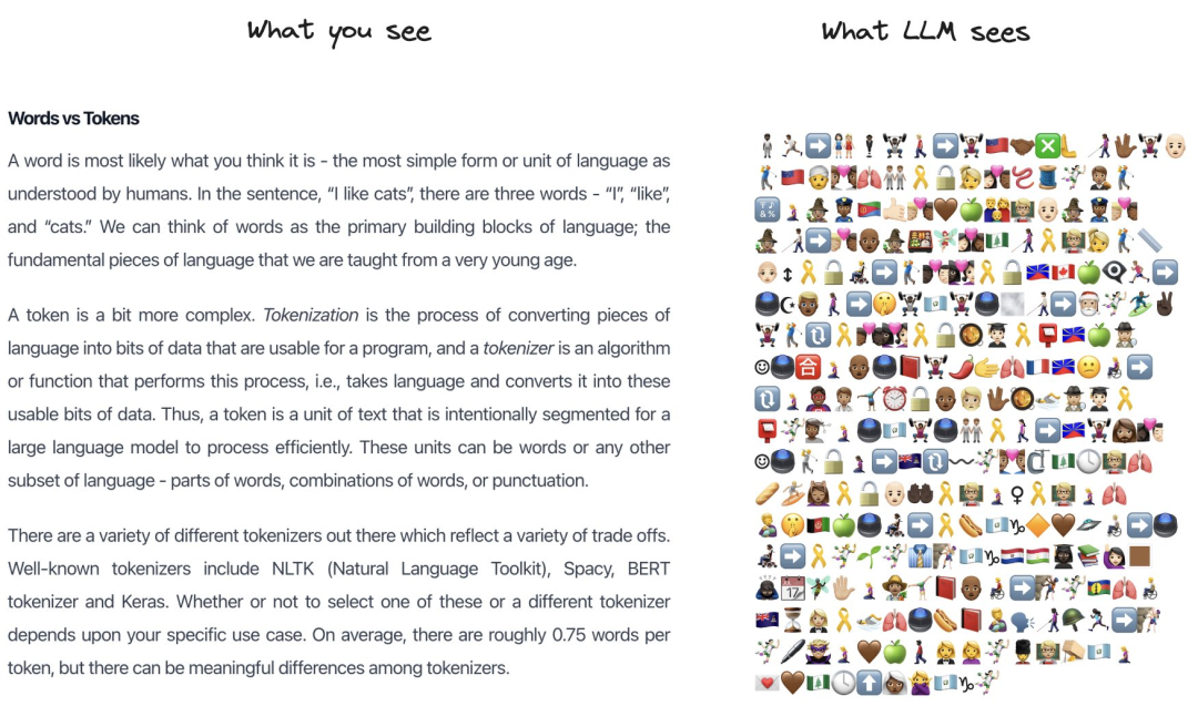这个问题也吸引了刚刚投身 AI + 教育行业的 Karpathy 的注意。为了让大家直观地看到大模型眼里的文字世界,他特地写了一个小程序,用表情符号(emoji)来表示 token。