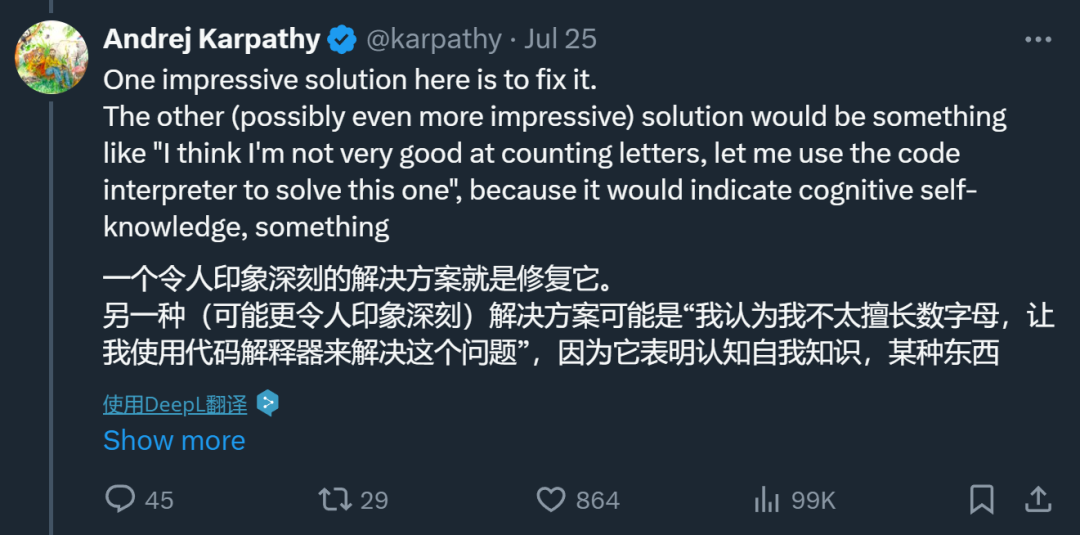 Karpathy 认为,这一问题的核心在于目前的大模型缺乏「认知自我知识(cognitive self-knowledge)」( 模型自身对其知识和能力的自我认知 )。如果模型具备这种能力,它可能会在面对「数字母」这样的问题时回答说,「我不太擅长数字母,让我使用代码解释器来解决这个问题」。