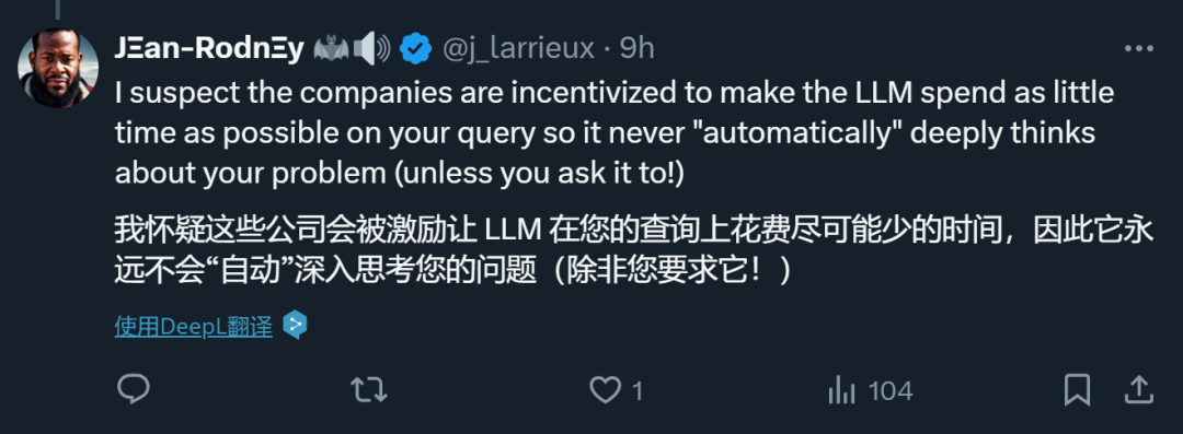 对此,有人猜测说,大模型公司给 LLM 的设定可能就是让它在一个问题上花费尽可能少的时间,因此,除非你明确要求,不然它不会主动去深入思考。