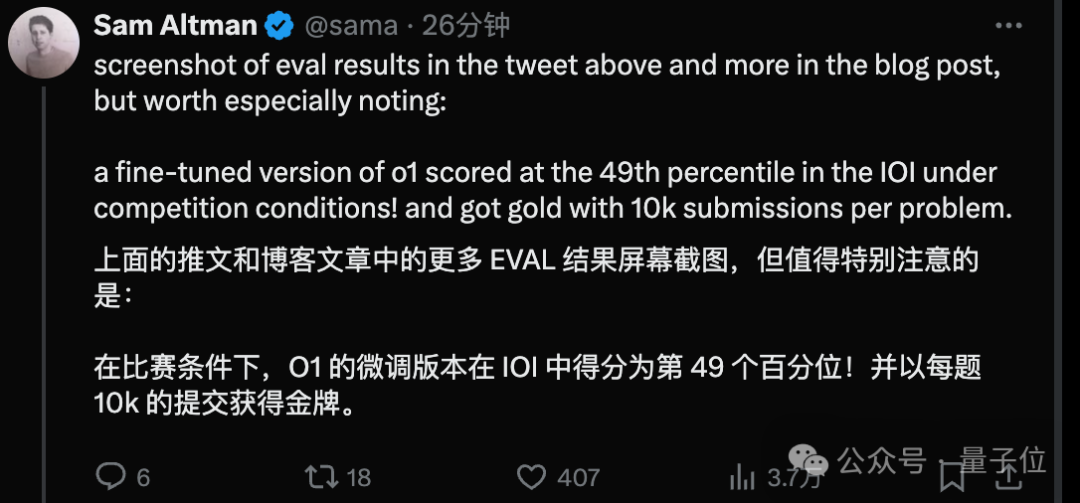 在刚刚结束的2024 IOI信息学奥赛题目中,o1的微调版本在每题尝试50次条件下取得了213分,属于人类选手中前49%的成绩。