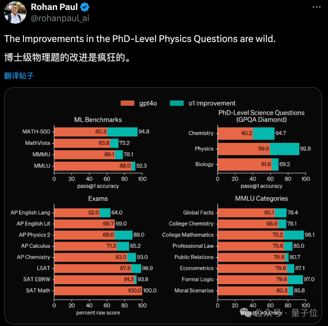 与GPT-4o相比,o1在数理化生、英语法律经济等各种科目都有不同成绩改进。