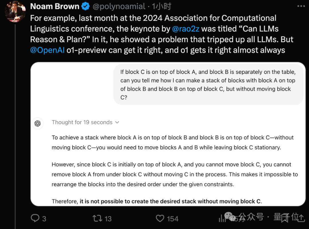 在上个月的ACL会议上有一个所有当时大模型都无法解决的逻辑难题。o1-preview能够做对,o1满血版几乎每次尝试都能做对。
