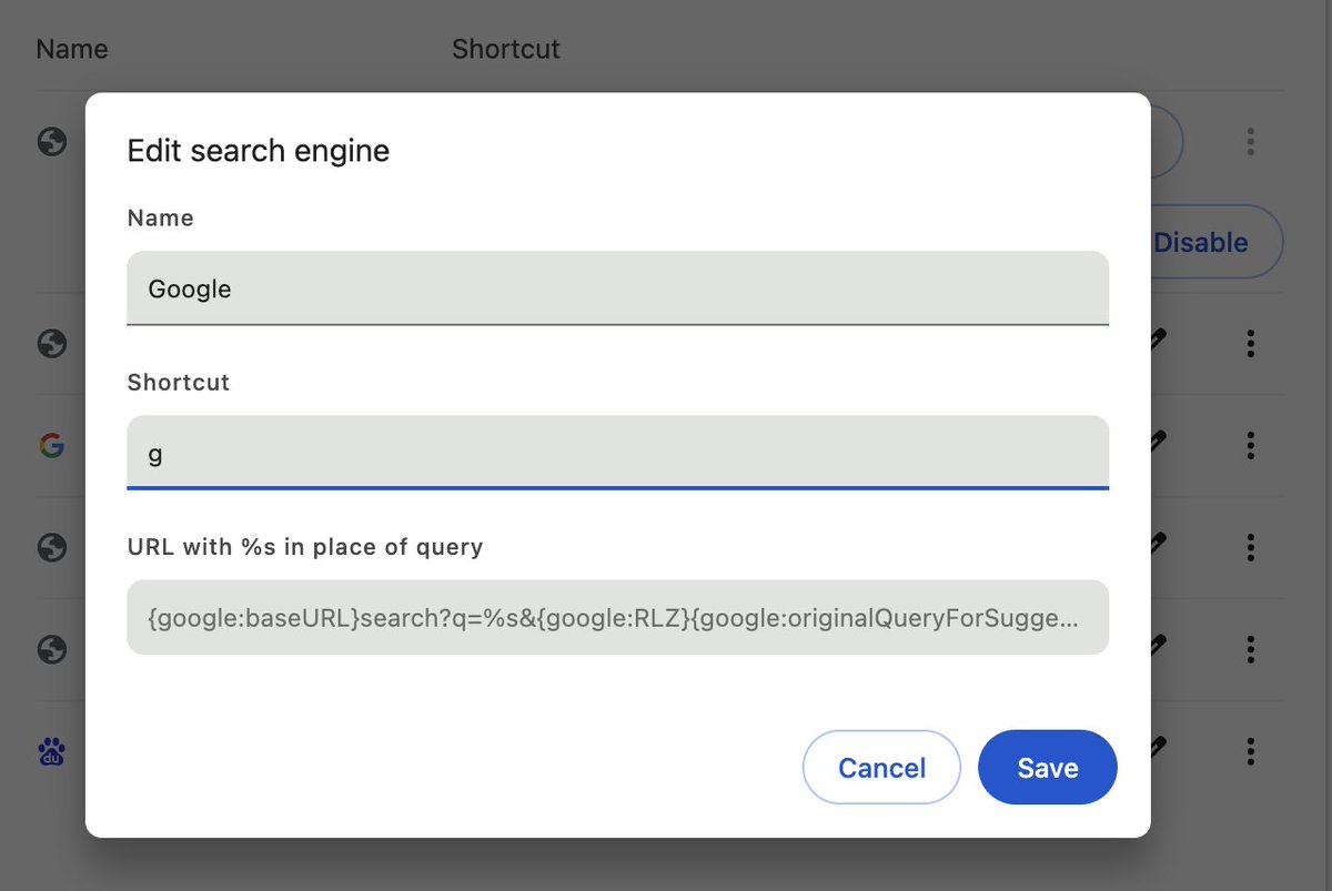 在chrome 当中,把google 搜索设置一个关键词。我设置为 g。这样,只要输入 g,空格,就可以直接使用 google了。