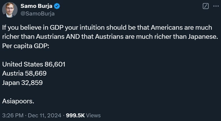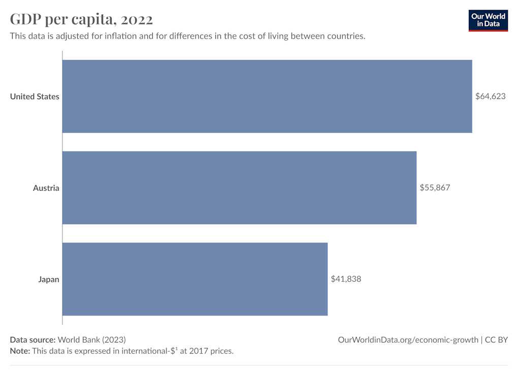 Now, Samo makes what I think is a major mistake here — using GDP at market exchange rates rather than at purchasing power parity. If only imports mattered for living standards, we could use market exchange rate GDP here, since that reflects how many imports you can afford. But because most of what people buy — rent, health care, transportation, and so on — is produced domestically, you really need to account for those prices when you measure living standards. If people can get cheaper rent, health care, and transportation, they are richer. This is what PPP tries to do. And when we look at the PPP numbers1 for the U.S., Austria, and Japan, they’re a lot closer together than the numbers Samo quoted: