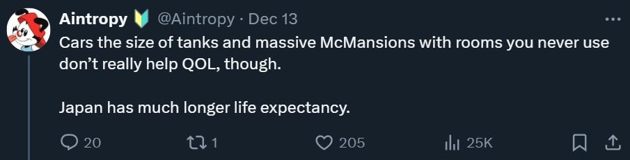 Appliances, too — Japanese clothes dryers don’t really dry your clothes, and central AC is a rarity. As incomes have diverged between America and Japan over the last two decades, I’ve noticed Americans buying all kinds of new modern conveniences — air fryers, Instant Pots, projectors, sound systems, and so on. As far as I can tell, most of these are still rare in Japan.4