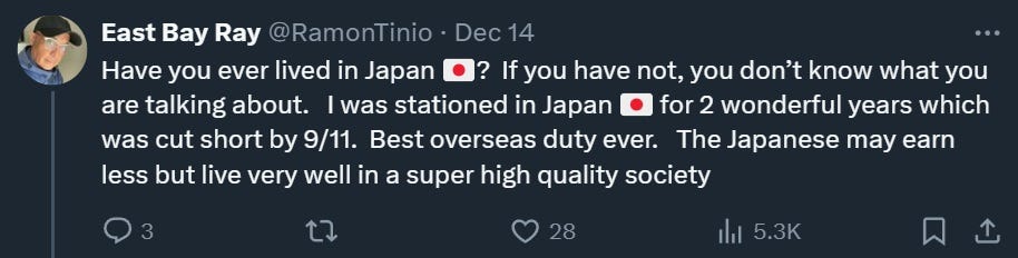 To answer East Bay Ray’s question, I have lived in Japan for four years, so I think I have a decently good perspective on how Japanese people live. I think what’s going on here is that Ray lived in Japan a while ago, and Japan and the U.S. used to be a lot closer to each other in terms of living standards: