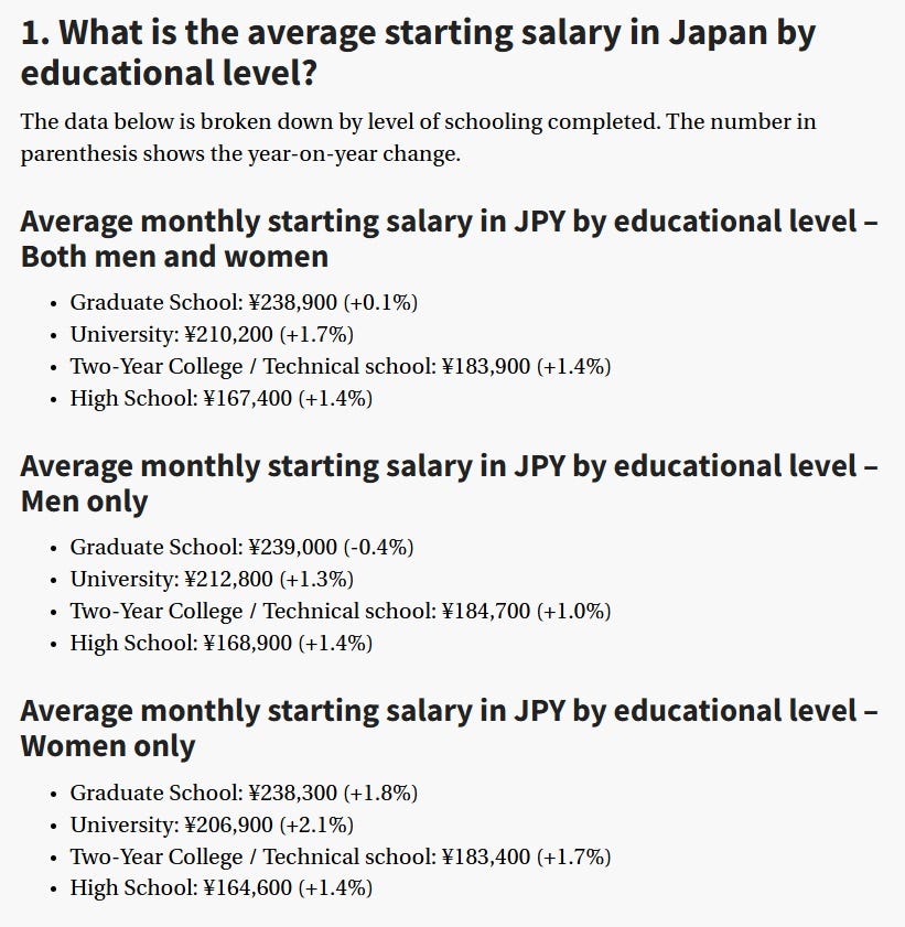 Let’s start with salaries. The Japanese government takes surveys of starting salaries, and the good folks at RealEstateJapan have a handy table breaking down the 2019 numbers for us: