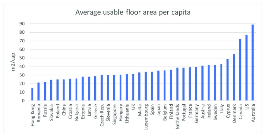 Those monetary differences translate into real differences in consumption. Let’s take housing, which is the biggest item in both Japanese and American budgets. Japanese houses are actually average by rich-country standards, but still much smaller than American ones. Here’s residential floor space per capita: