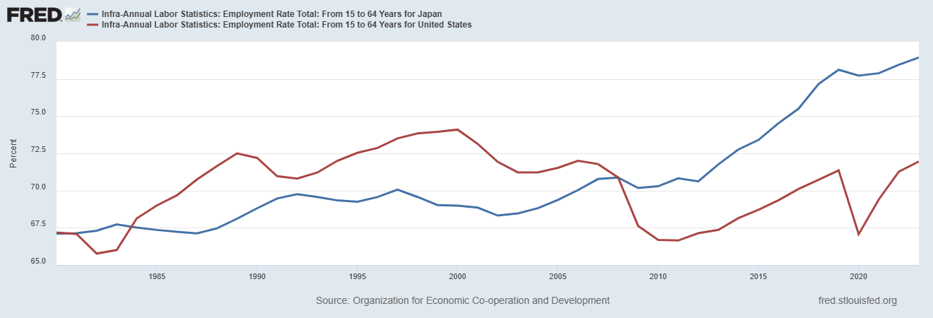First of all, despite Japan’s greater fraction of elderly people, a significantly higher percentage of Japanese work than Americans. This was not always true, but since around 2010, essentially everyone in Japan has a job — women, the elderly, teenagers, etc.