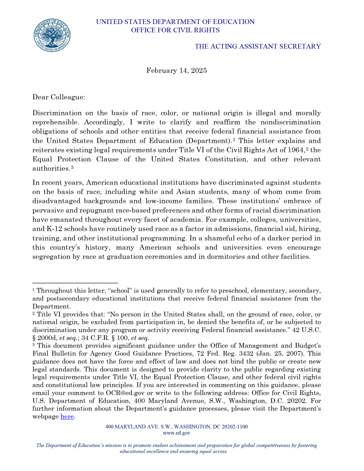 Late Friday night, the U.S. Department of Education’s Office for Civil Rights (OCR) put colleges on notice: stamp out all race-conscious policies and programming immediately or risk losing federal funding.
