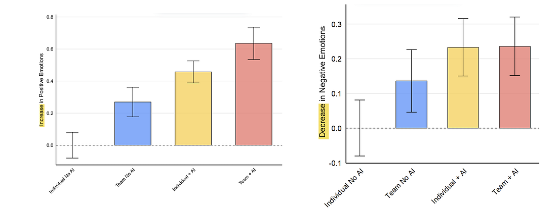People using AI reported significantly higher levels of positive emotions (excitement, energy, and enthusiasm) compared to those working without AI. They also reported lower levels of negative emotions like anxiety and frustration. Individuals working with AI had emotional experiences comparable to or better than those working in human teams.