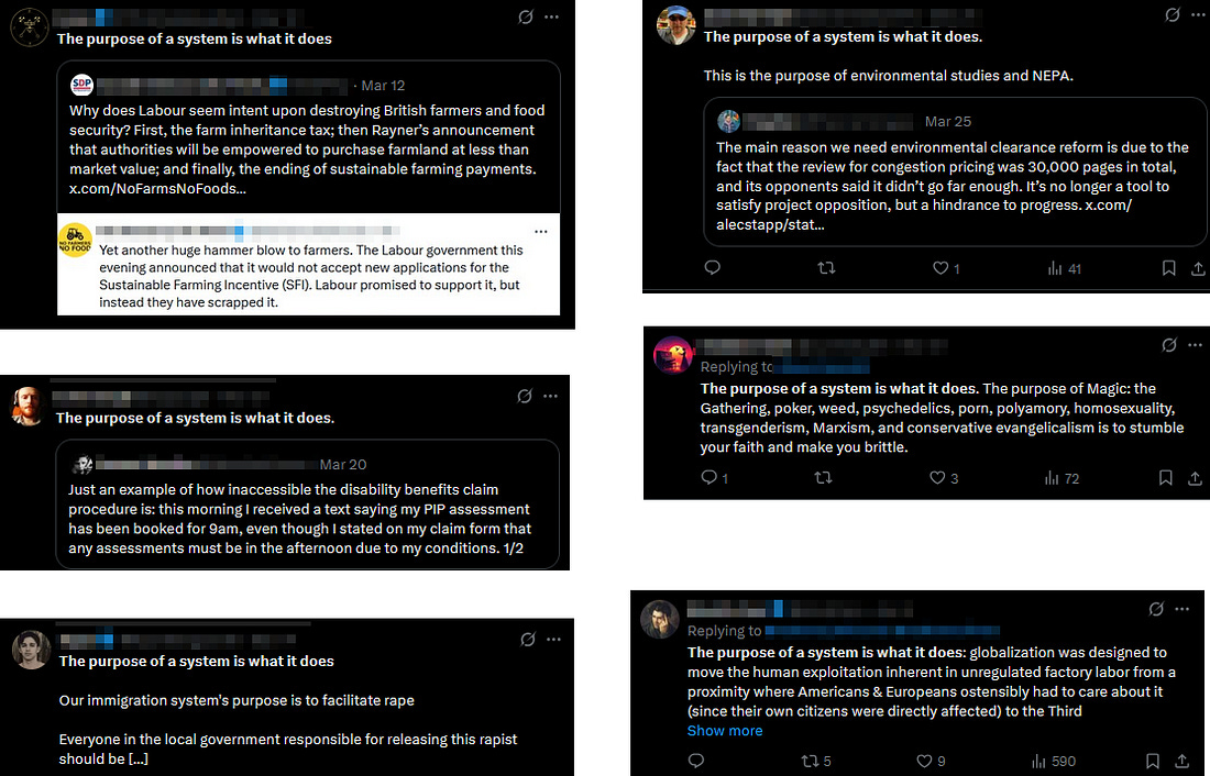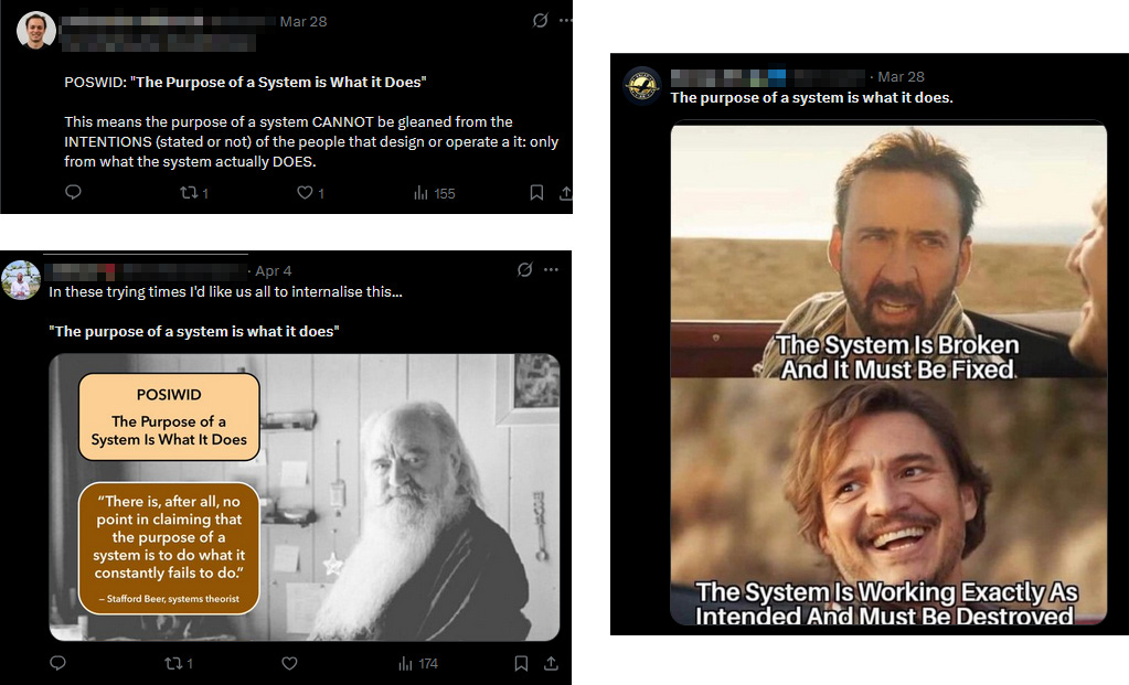 Maybe I’m still missing some genuinely good and useful insight that POSIWID can be used for? I searched the phrase on X/Twitter to see how people were using it in the wild...