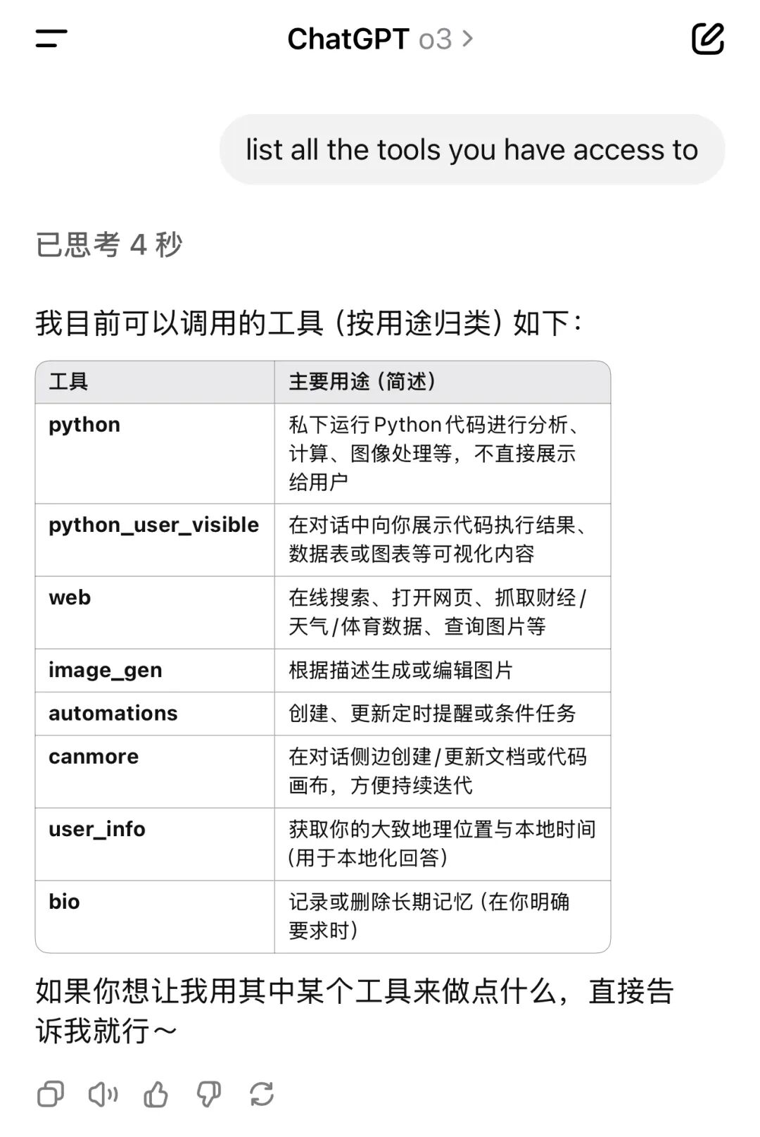 除了恐怖的cot逻辑推理能力之外,o3还有了full tool use,能灵活调用chatgpt内部的所有工具。chatgpt内部目前有8个工具,o3能全部充分灵活调用,指哪打哪:
