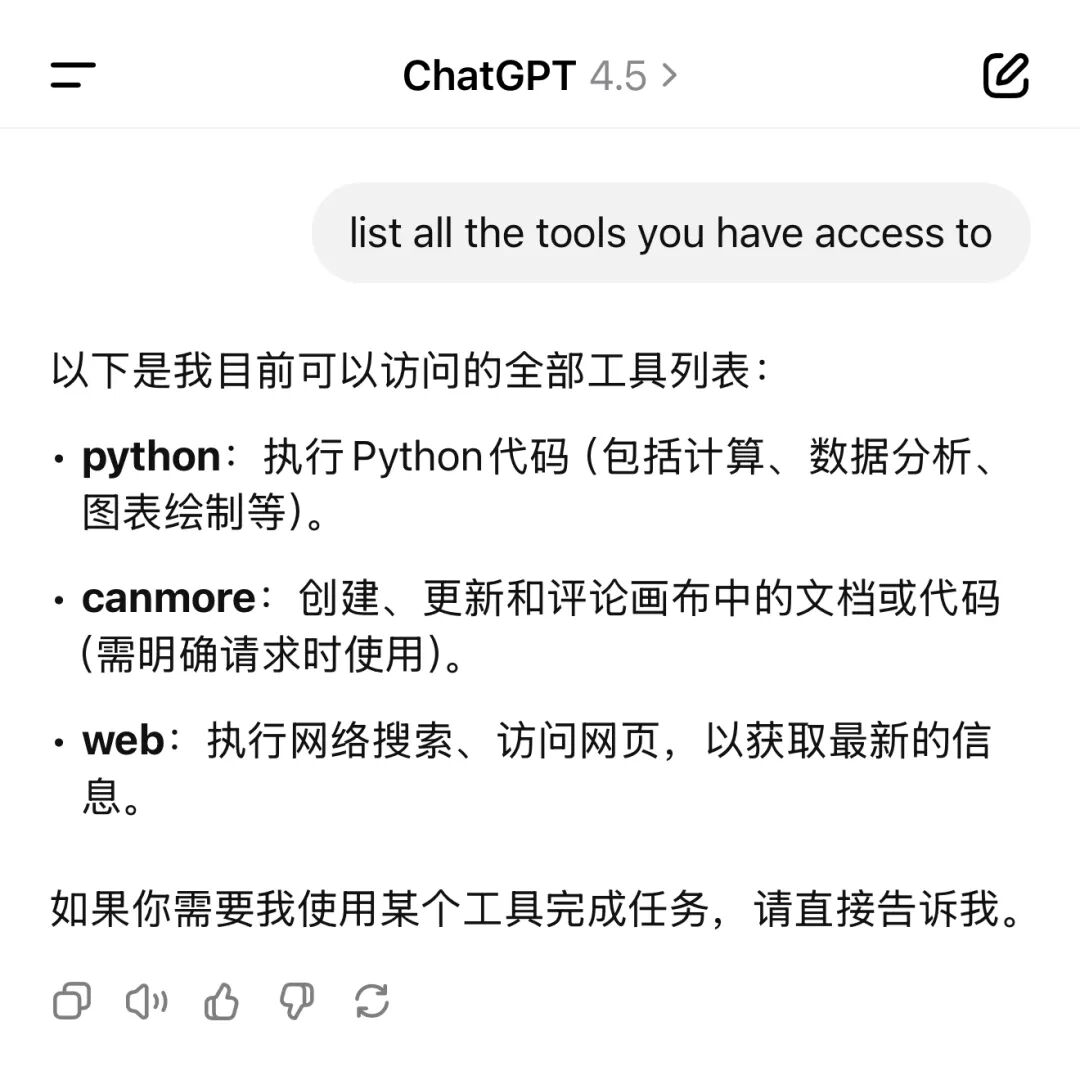 对比之下,gpt-4.5只有python、联网和canvas文档;
