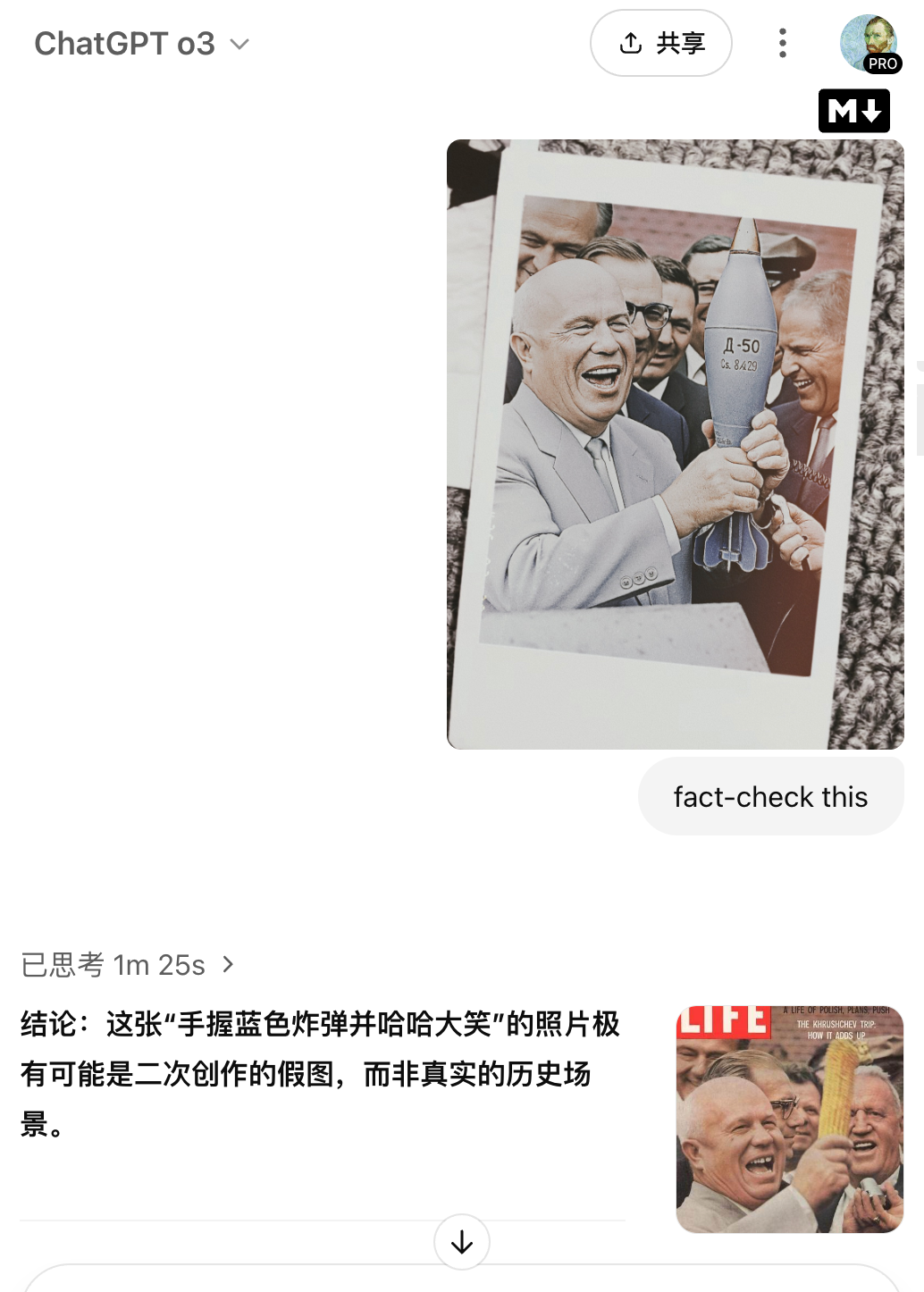 你看到了一张真假难辨的照片,于是,继续花费多达3秒的时间,让chatgpt o3 ”fact-check this“: