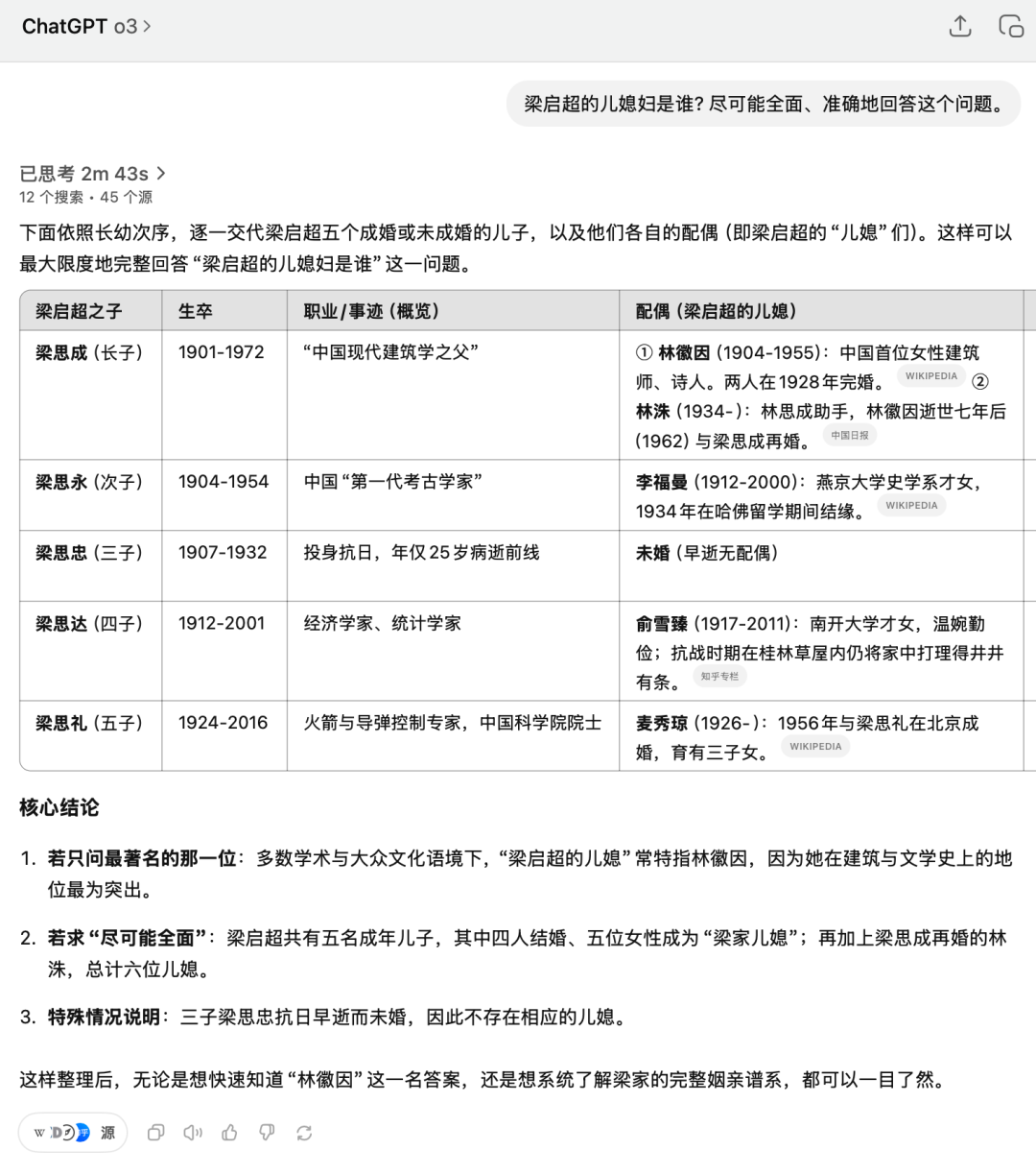 2分43秒的思维过程如下。o3作为首个agentic llm,可以灵活调用search工具(gpt-4o当时的回答还是胡编乱造),而且,强大的reasoning 能力,有了search加持,就是名副其实的deep search。