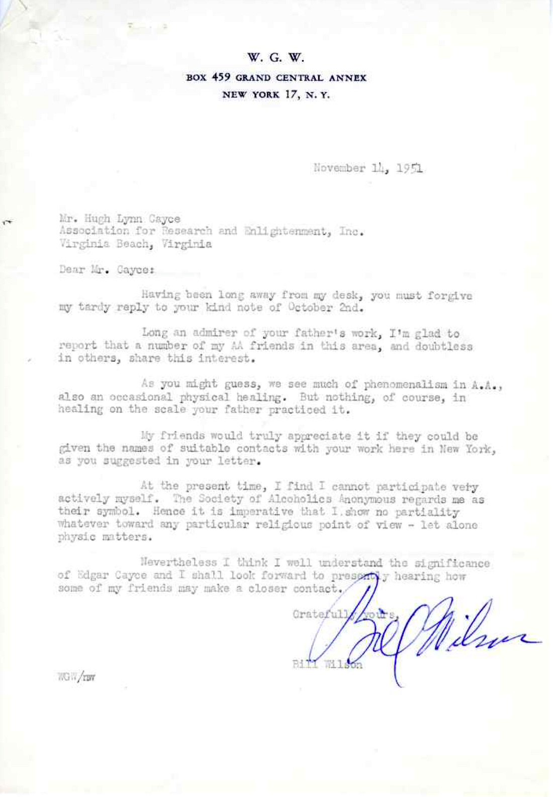 An archivist at the Edgar Cayce Foundation in Virginia Beach, VA, graciously sent me the recently catalogued letter that Bill Wilson wrote to Edgar Cayce’s son, Hugh Lynn Cayce, on November 14, 1951.