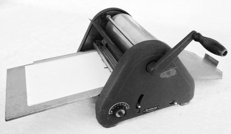 直到現在,我才回想起那些藍色的紙張,以及老師用來印製它們的那台滾筒狀機器。我曾經有幸幫老師印過新的講義。但直到現在,都 2020 年代了,我才開始好奇:那東西*到底*是怎麼運作的?