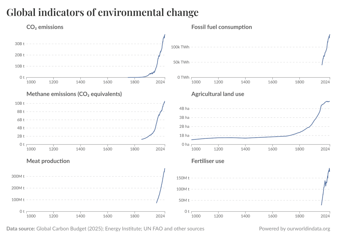 Coming from an environmental background, I would have said the same. Look at any series of graphs on environmental pressure, and it’s not hard to see why people would frame it as a new problem. Plot global curves of carbon dioxide emissions, land use, air pollution, global temperatures, or fertiliser use, and they all rise sharply in the last century. It creates the impression that things were fine, but now they’re really not. It’s these curves that often make people — especially young people — feel fatalistic about the future. I was certainly one of them.
